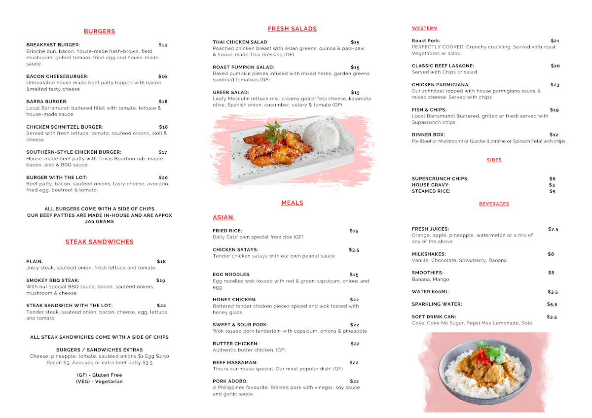 Cuisine Type: Daily Eatz specializes in modern Australian fare, focusing on fresh ingredients and comfort food classics. The café’s menu is a tempting mix of vibrant summer salads, hearty mains, and satisfying steak sandwiches. Treat yourself to the Pawpaw Salad or the Creamy Potato Salad for a refreshing start, each priced at A$50.00. For main courses, the Classic Beef Stroganoff and the Beef or Chicken Country Style both present formidable choices at A$60.00, showcasing rich flavors that'll transport your taste buds.